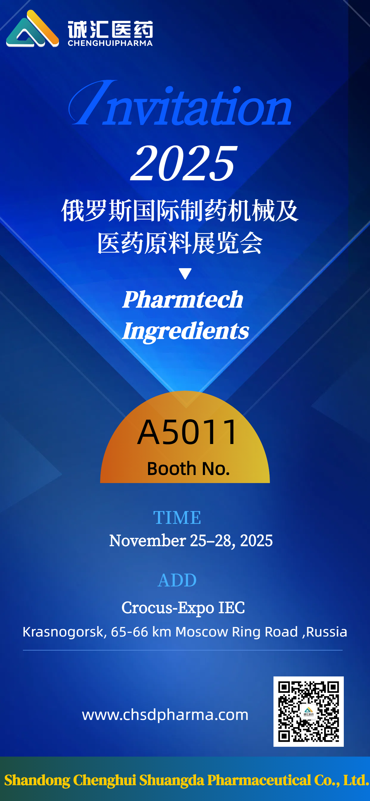 山东诚汇医药集团始终以创新为驱动,以合作为纽带,期待与您共绘医药产业高质量发展的宏伟蓝图。2025年11月25日-28日,莫斯科克洛库斯国际会展中心A5011展位,我们不见不散!